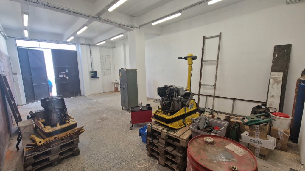 Vchod případně vjezd železnými vraty 2,9m x 3,6m. Vhodné i pro hlučnější výrobu. Je možné vysoké zatížení betonové podlahy. V prostoru je k dispozici rozvod napětí 230/400V, osvětlení, zásuvky, voda, odpad, internet.